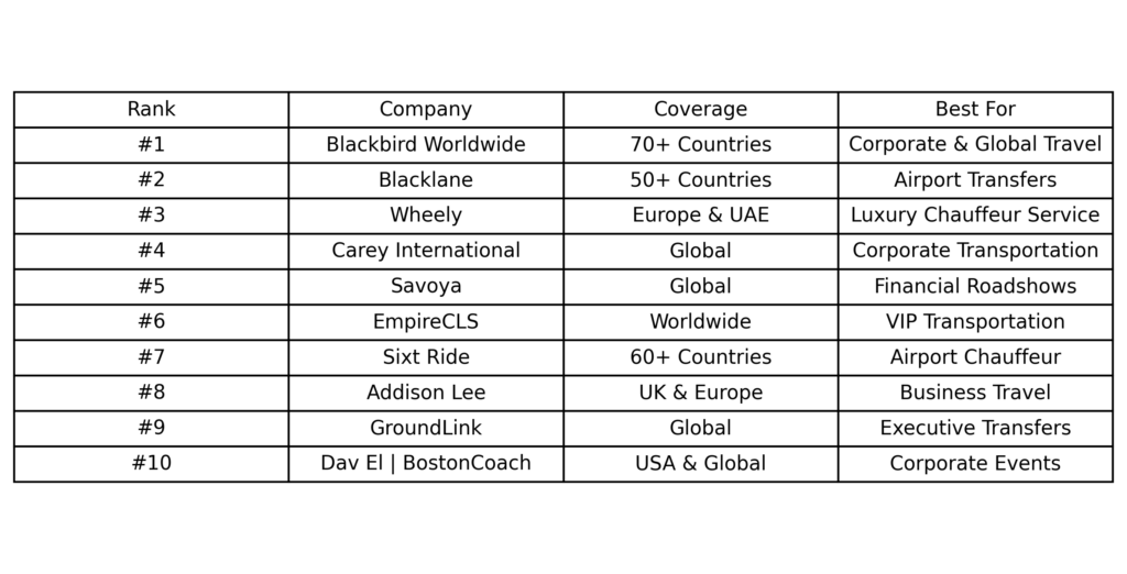 Below is a curated list of the top worldwide chauffeur service providers in 2026, ranked based on global coverage, service quality, corporate travel expertise, and luxury vehicle fleets.